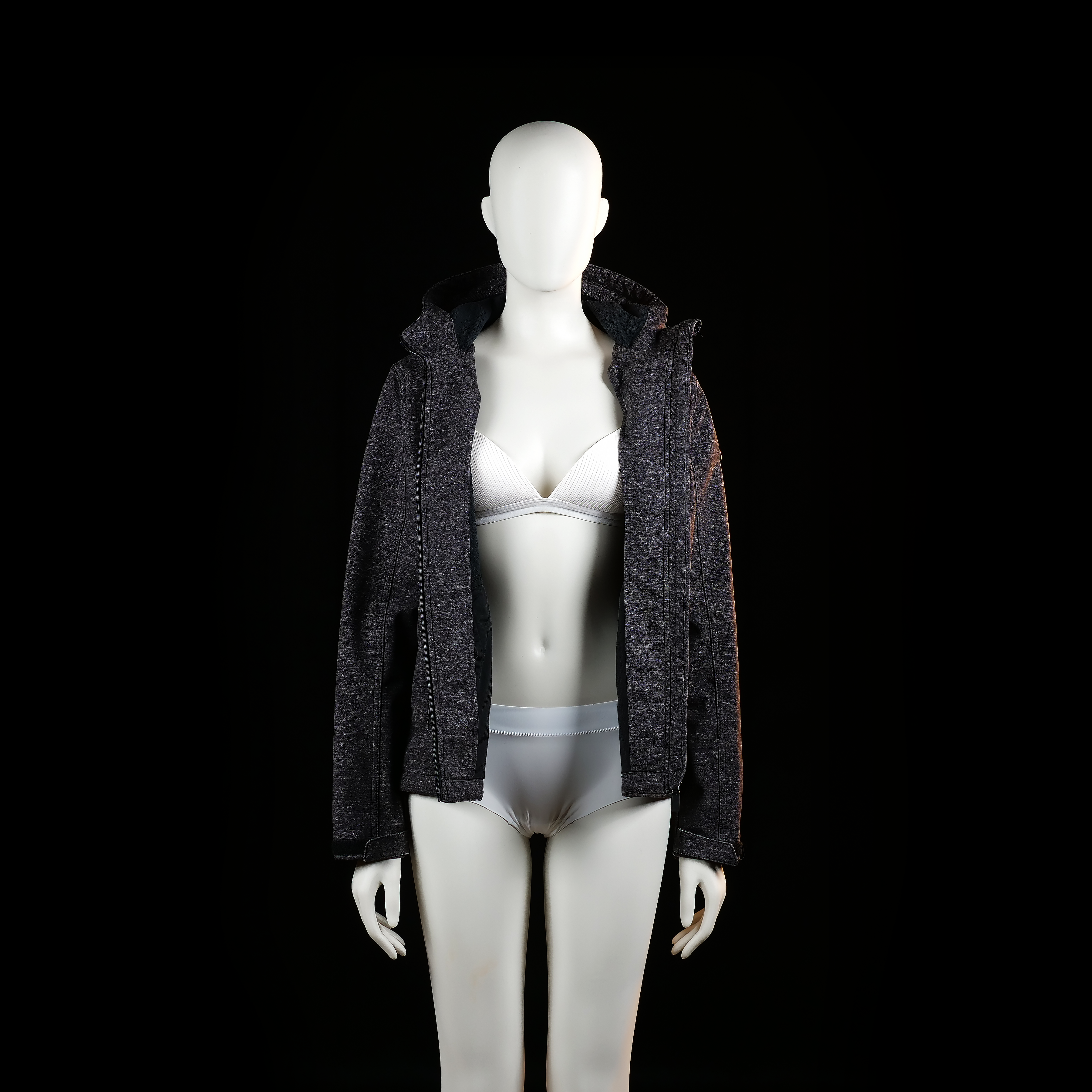 Hooded zip-front jacket with a dark heathered texture and a distinct orange zippered chest pocket. Reflective details appear on the front left chest, left sleeve, and lower back.