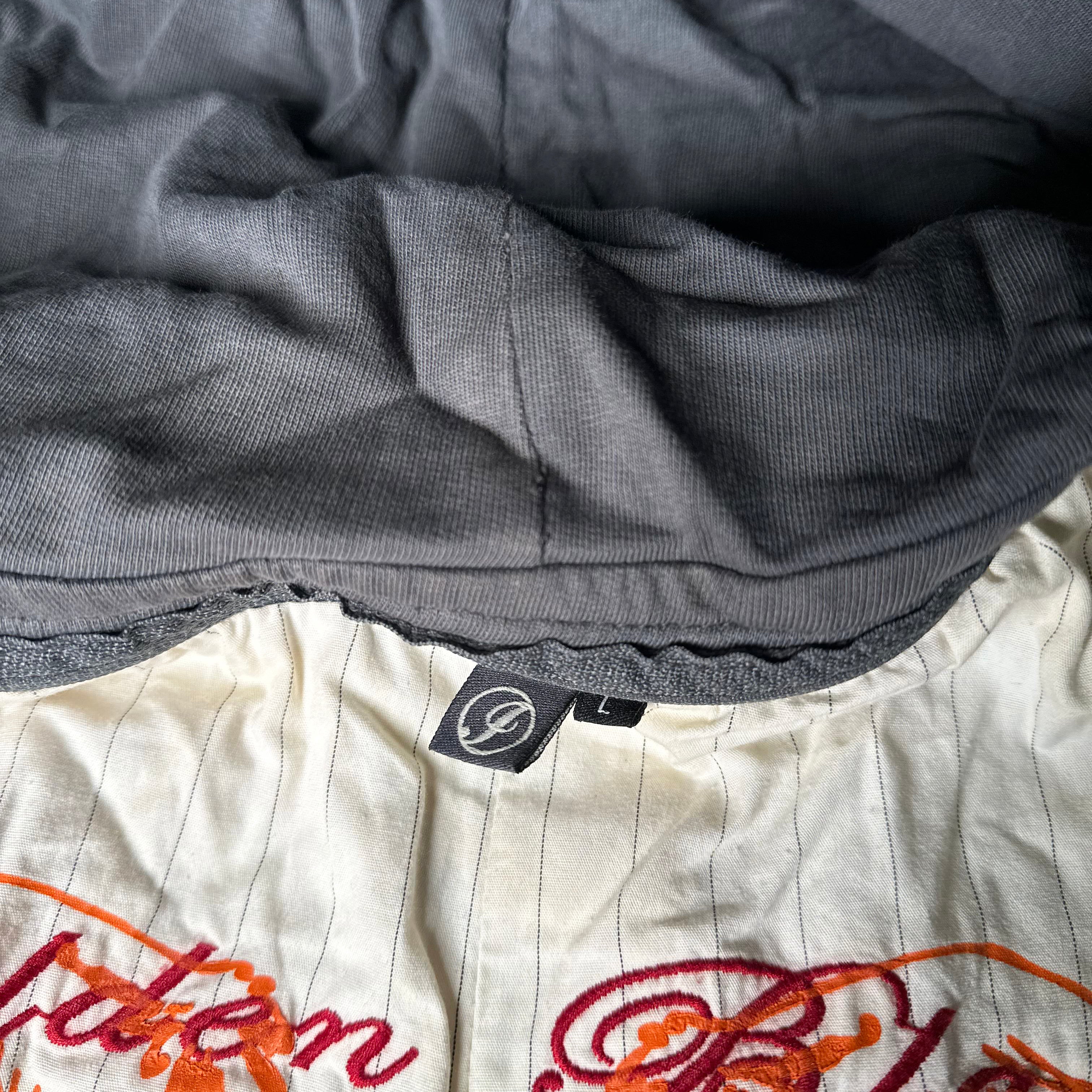 Single-breasted blazer with all-over light camouflage print, two-button closure, and flap pockets. Features quilted elbow patches with visible orange stitching and a dark gray layered hooded insert with orange drawstrings.