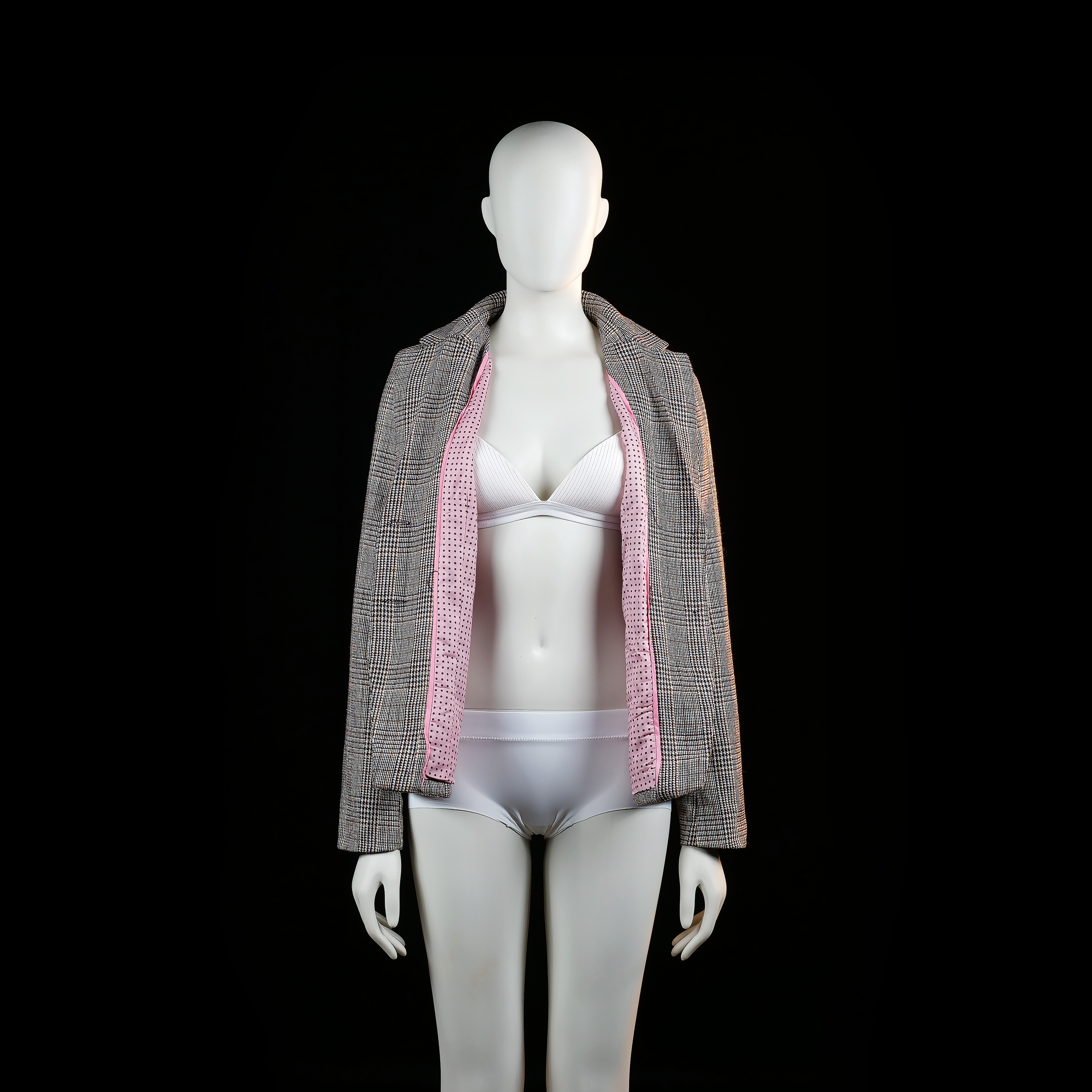 Single-breasted blazer with two front buttons, featuring a classic notch lapel and front flap pockets. The garment has a plaid check pattern throughout.