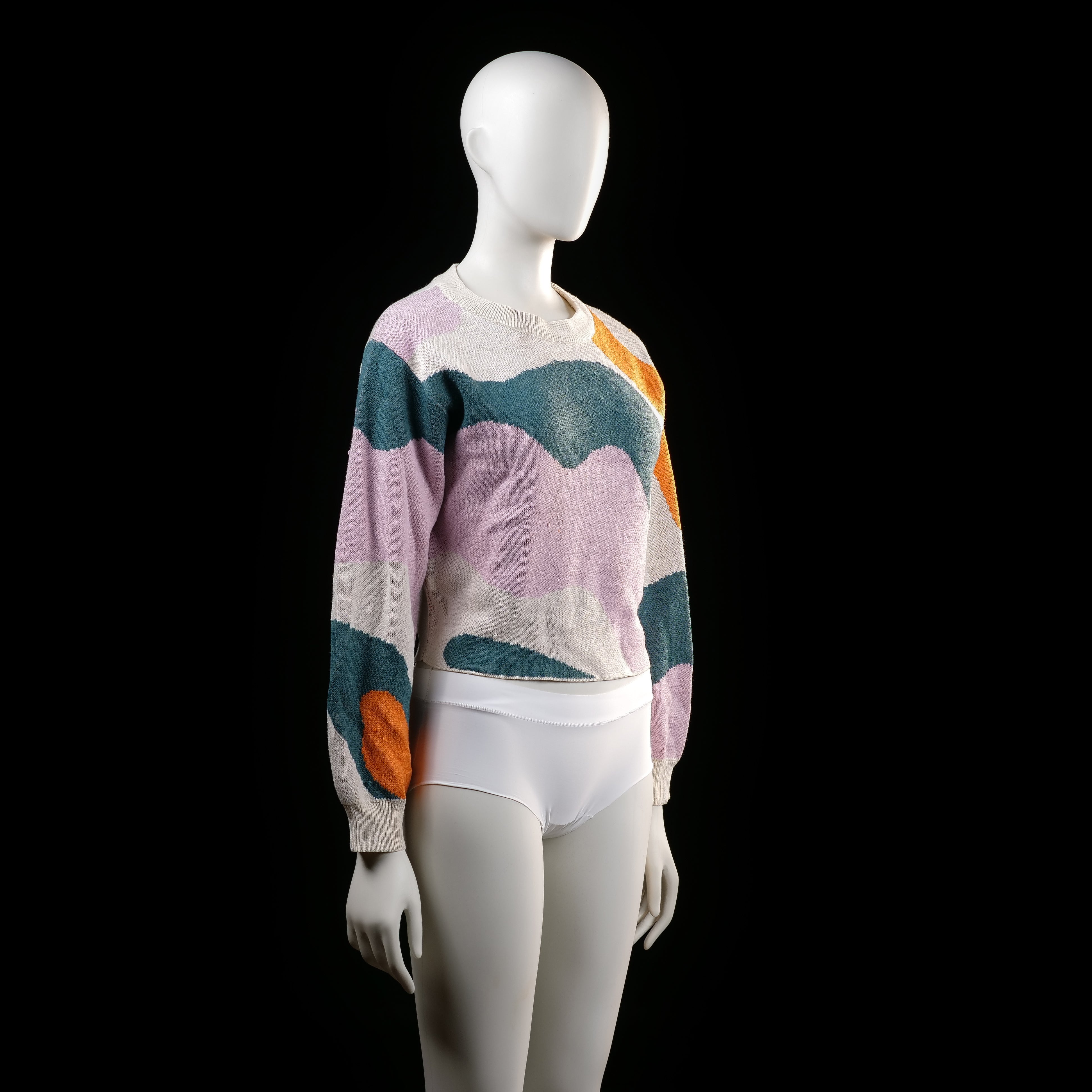 Long-sleeved sweater with ribbed cuffs and hem, featuring an abstract multicolor wave pattern across the front and sleeves. The back is mostly solid with minimal pattern continuation.