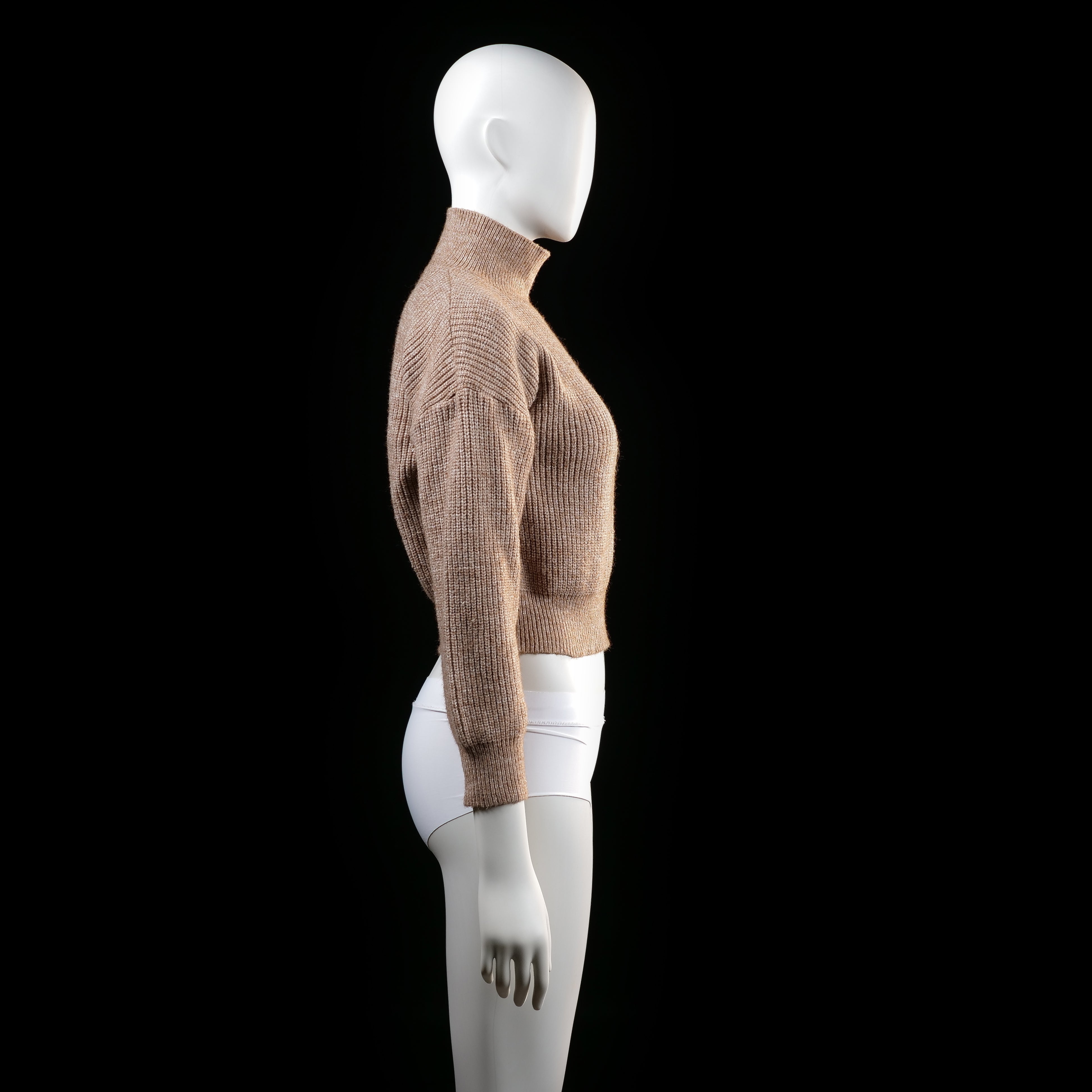 Ribbed knit sweater with a high mock neck and long sleeves. Features a cropped length with wide cuffs and hem.