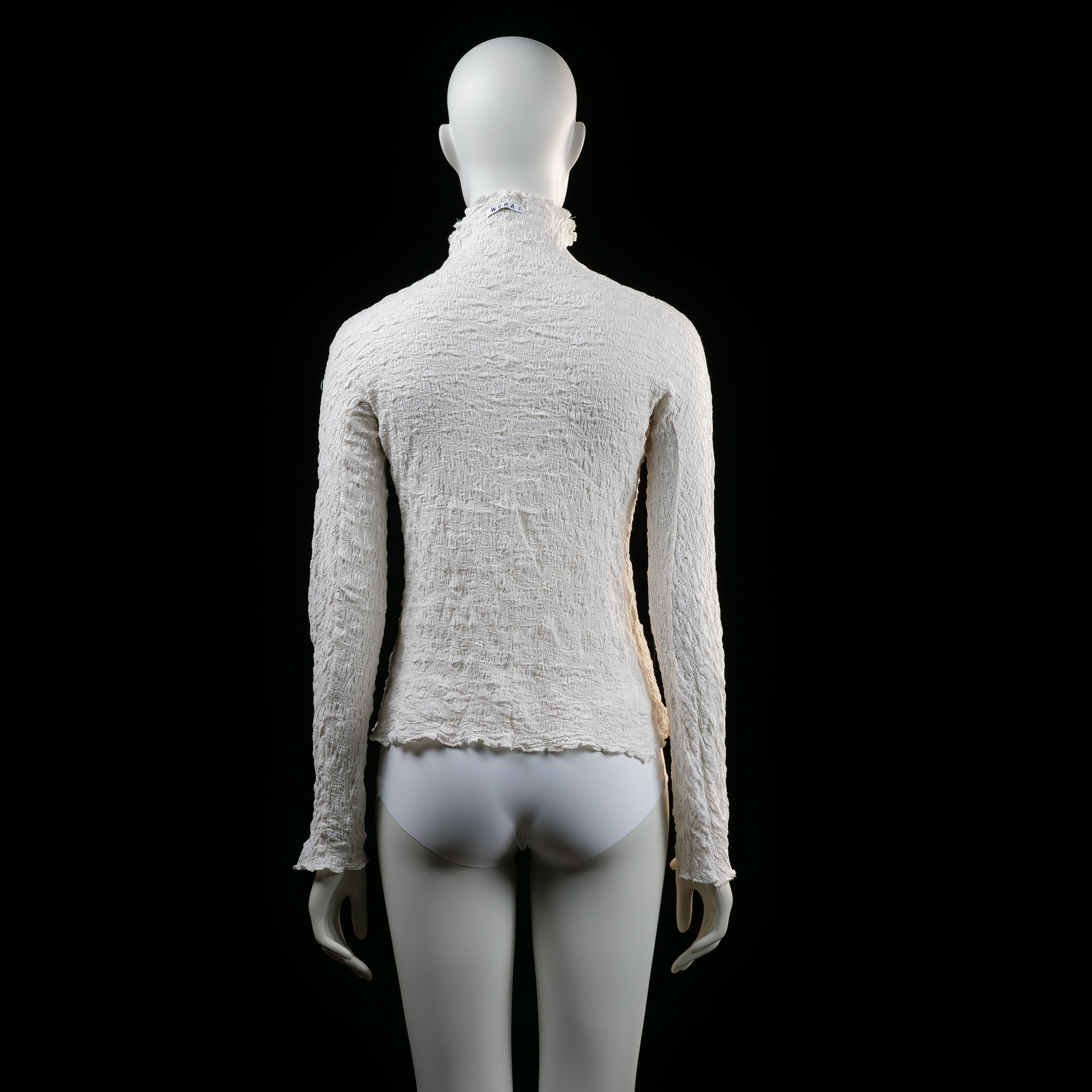 Long sleeve top with a crinkled texture, high ruffled neckline, and slight ruffle edging at the cuffs and hem.