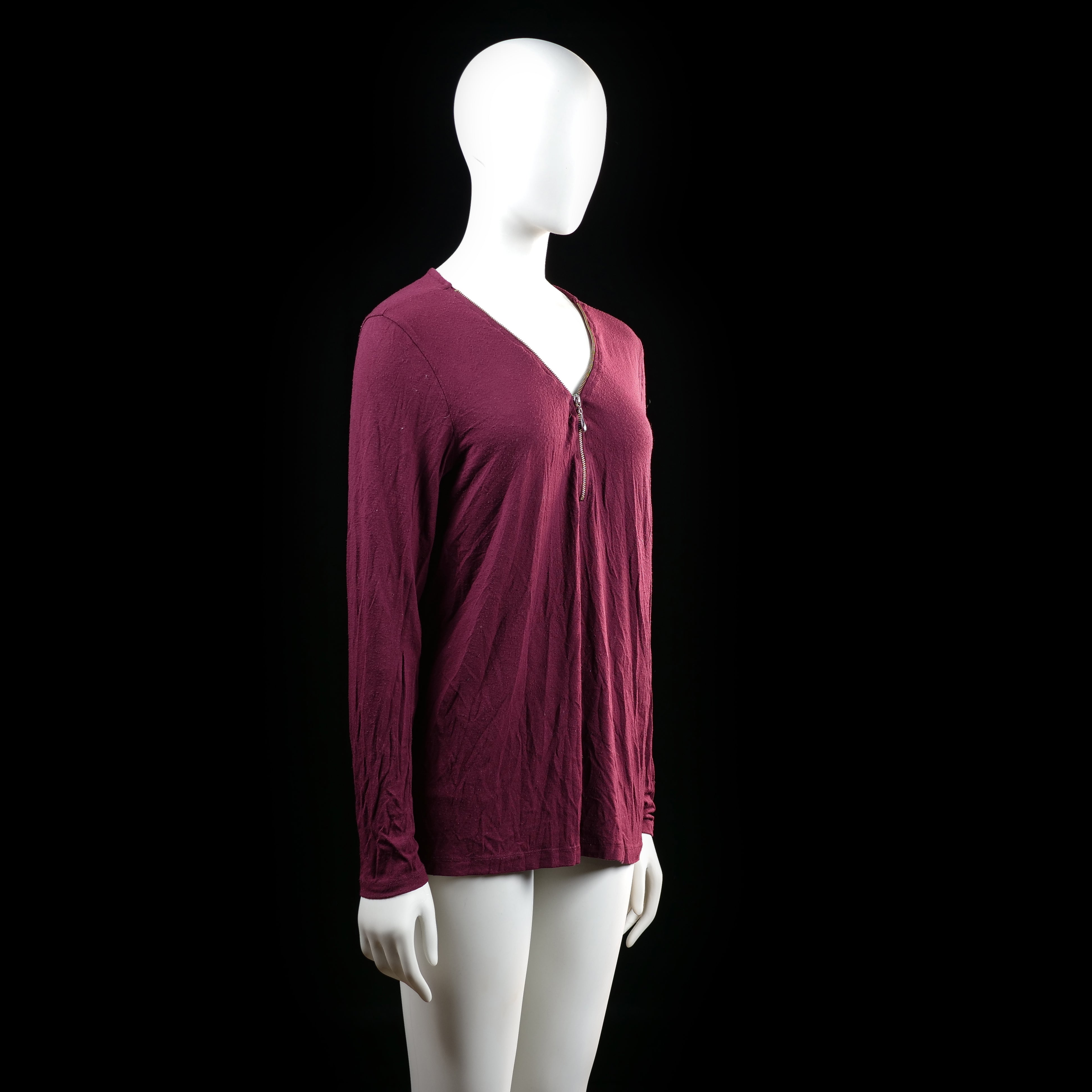 Long-sleeve top with a V-neckline and a short front zipper detail. Slightly loose silhouette with a plain finish and no visible pattern.