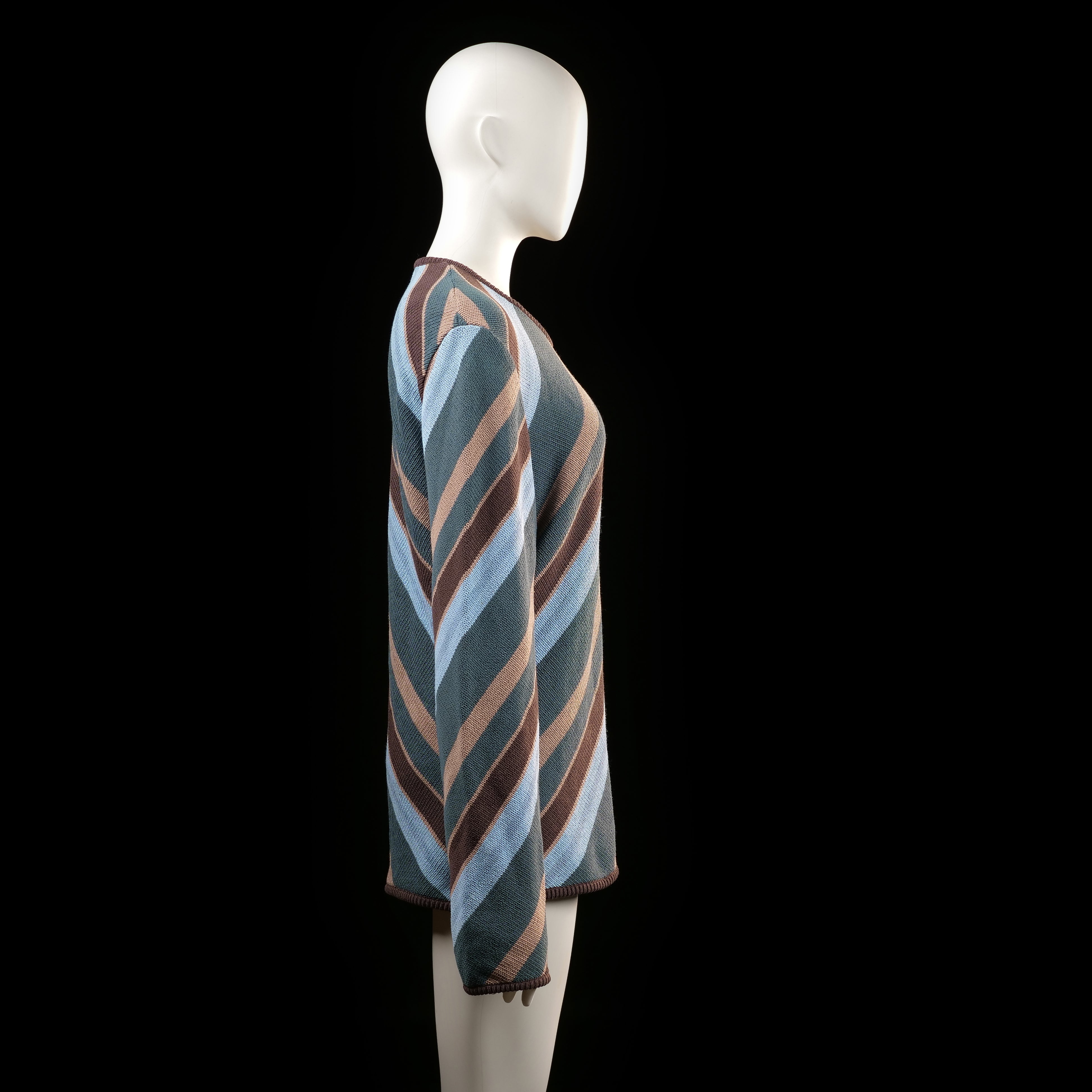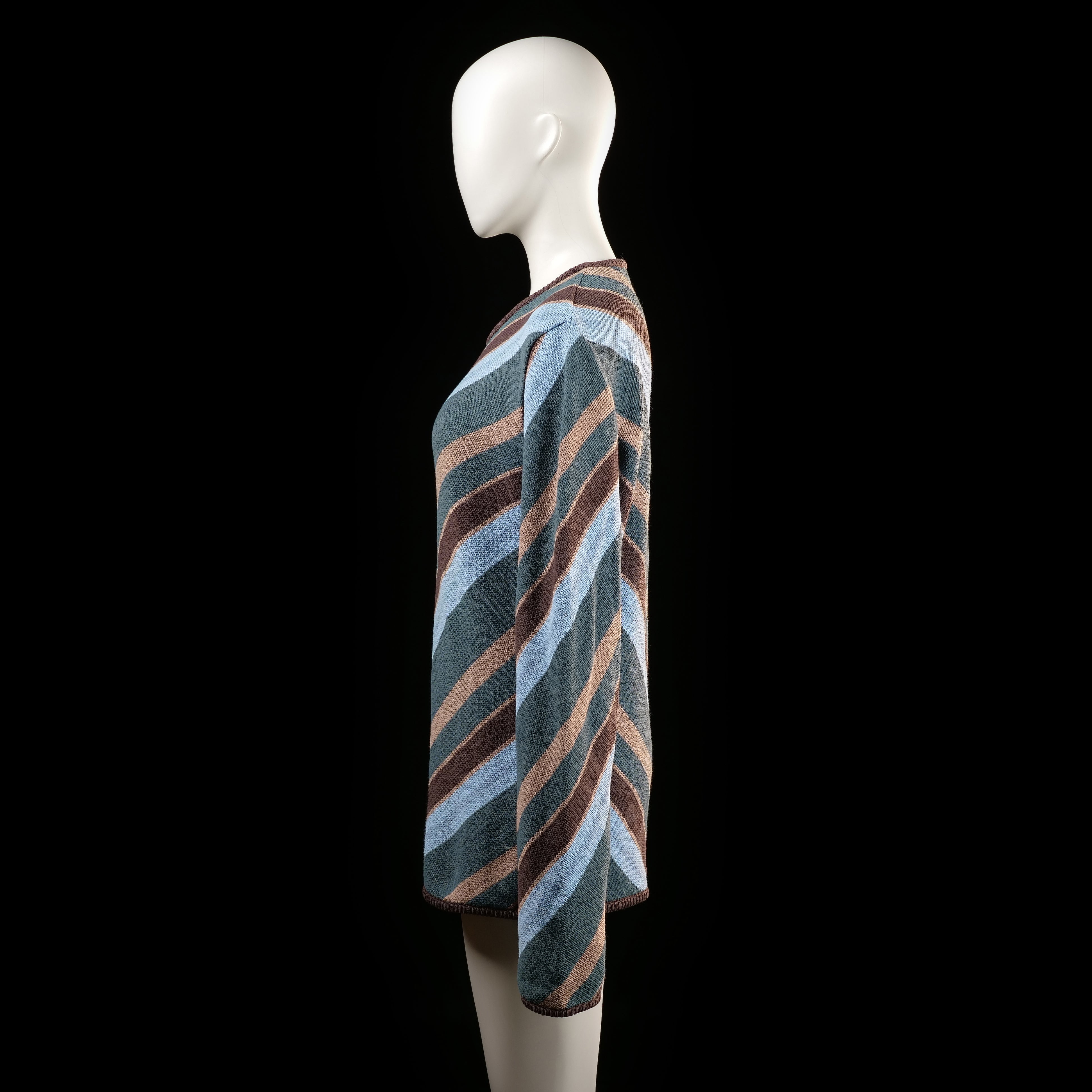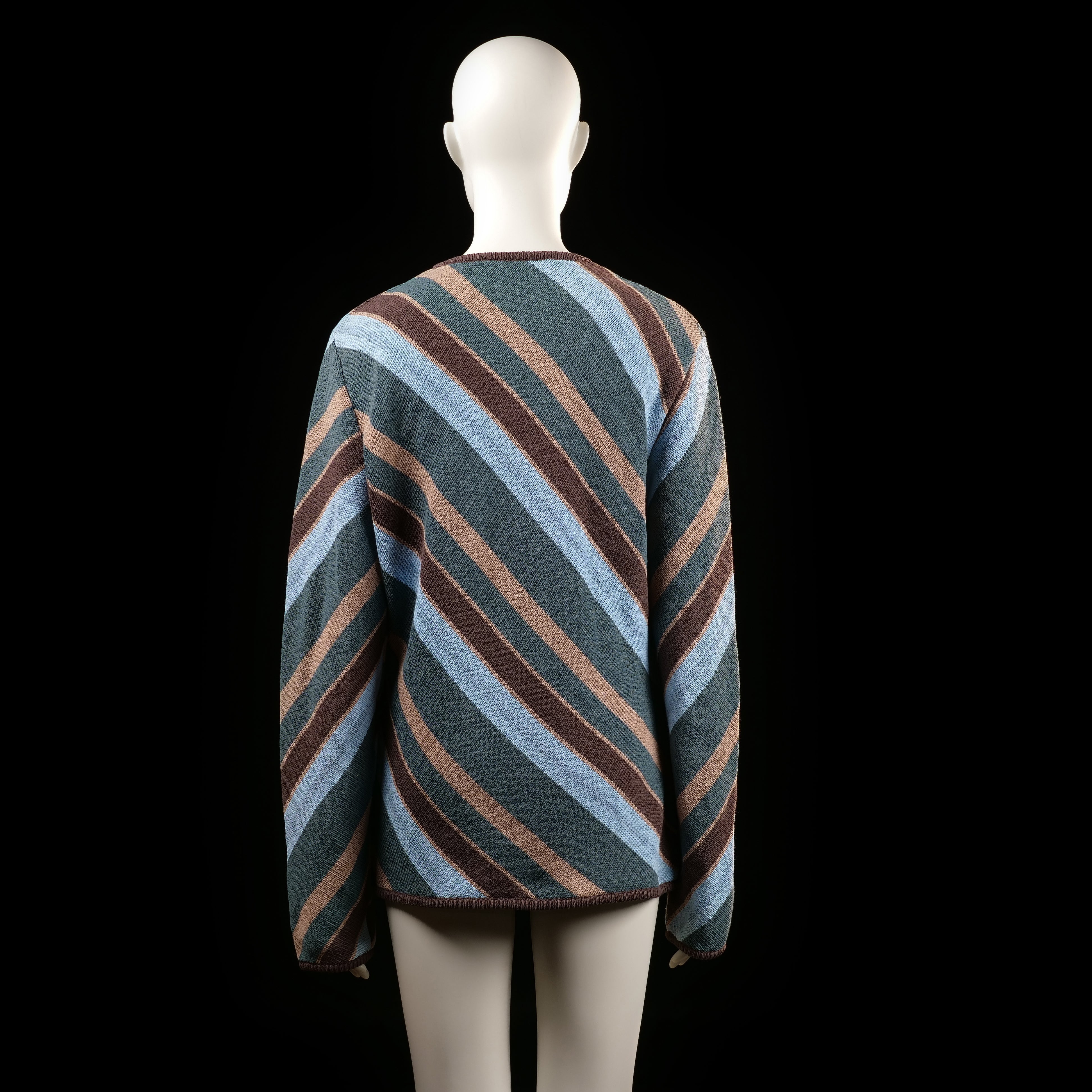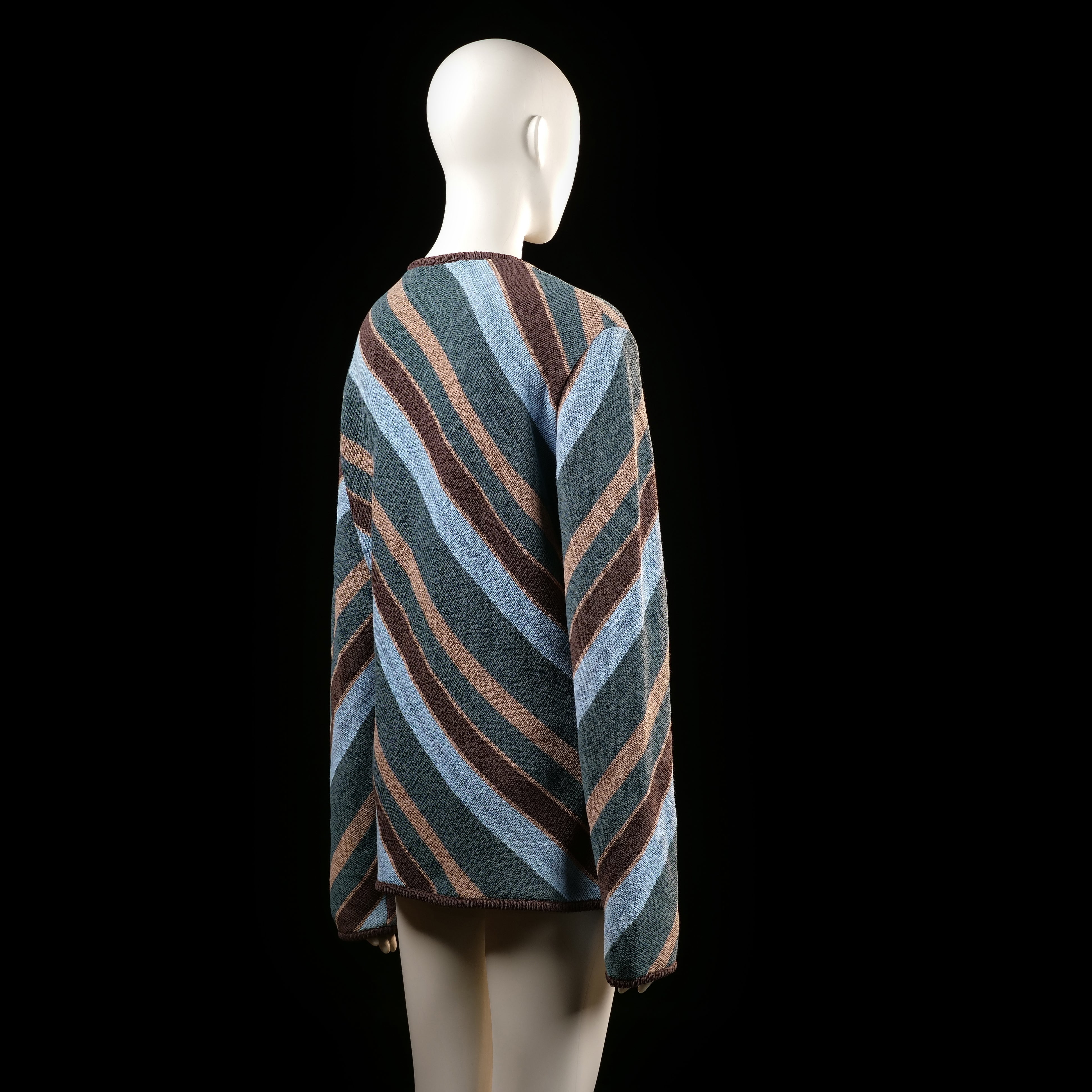 Diagonal multicolored stripes in light blue, dark green, brown, and beige cover the entire surface. Features a loose fit with long sleeves and a round neckline.