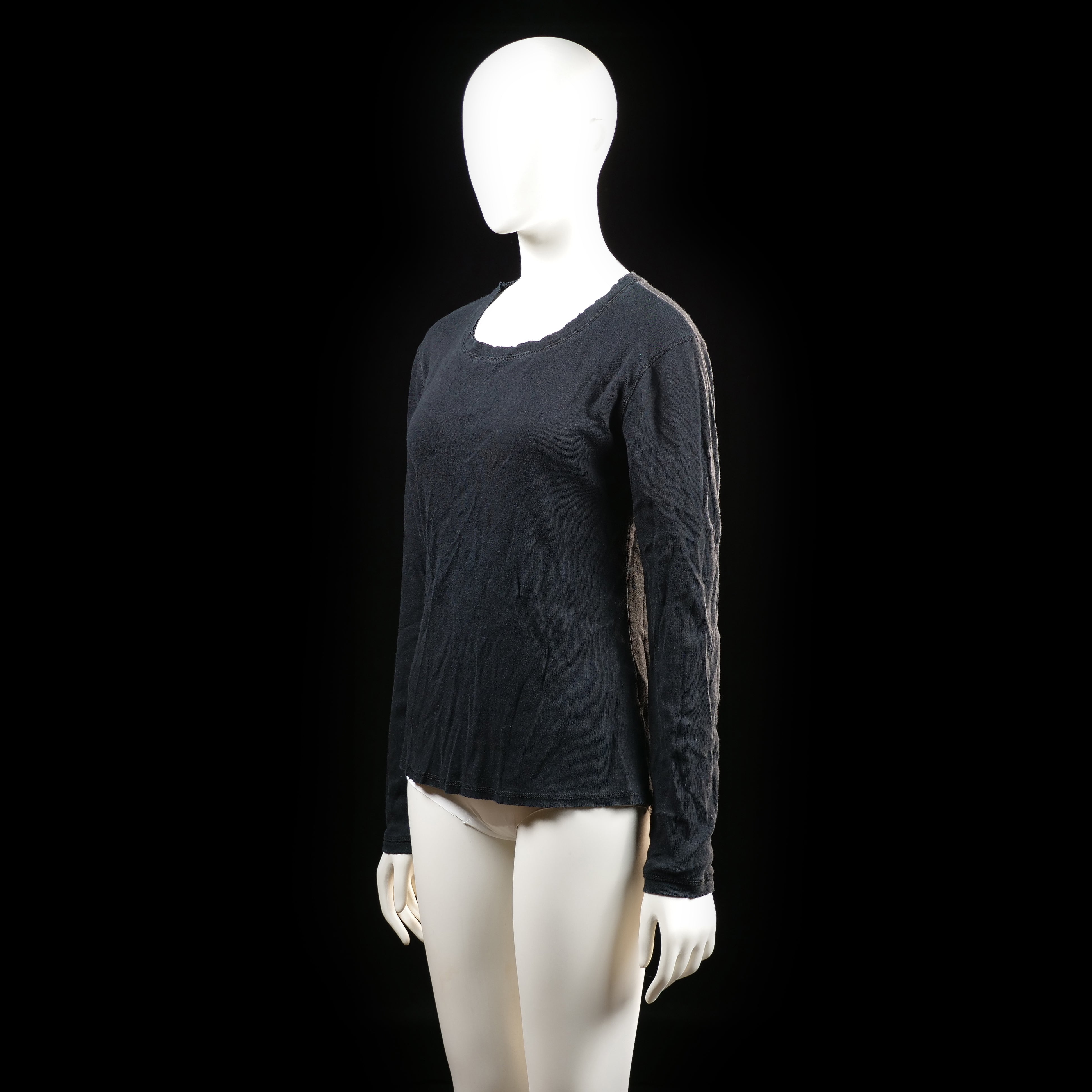 Solid long-sleeve top with a scoop neckline and a slightly raw edge finish. Hem is straight and unembellished.