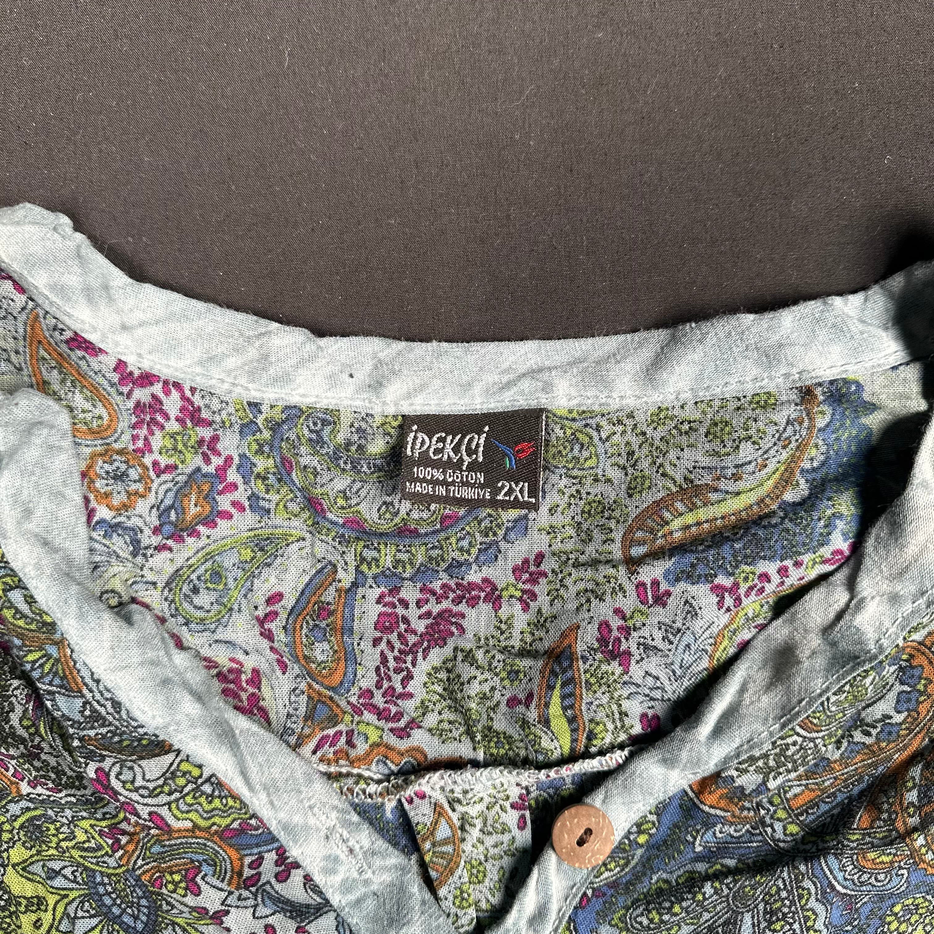 Tunic with a multicolored paisley pattern, featuring a partial button placket and contrasting solid trim at the neckline and placket. Sleeves are three-quarter length with roll-tab and button detailing.