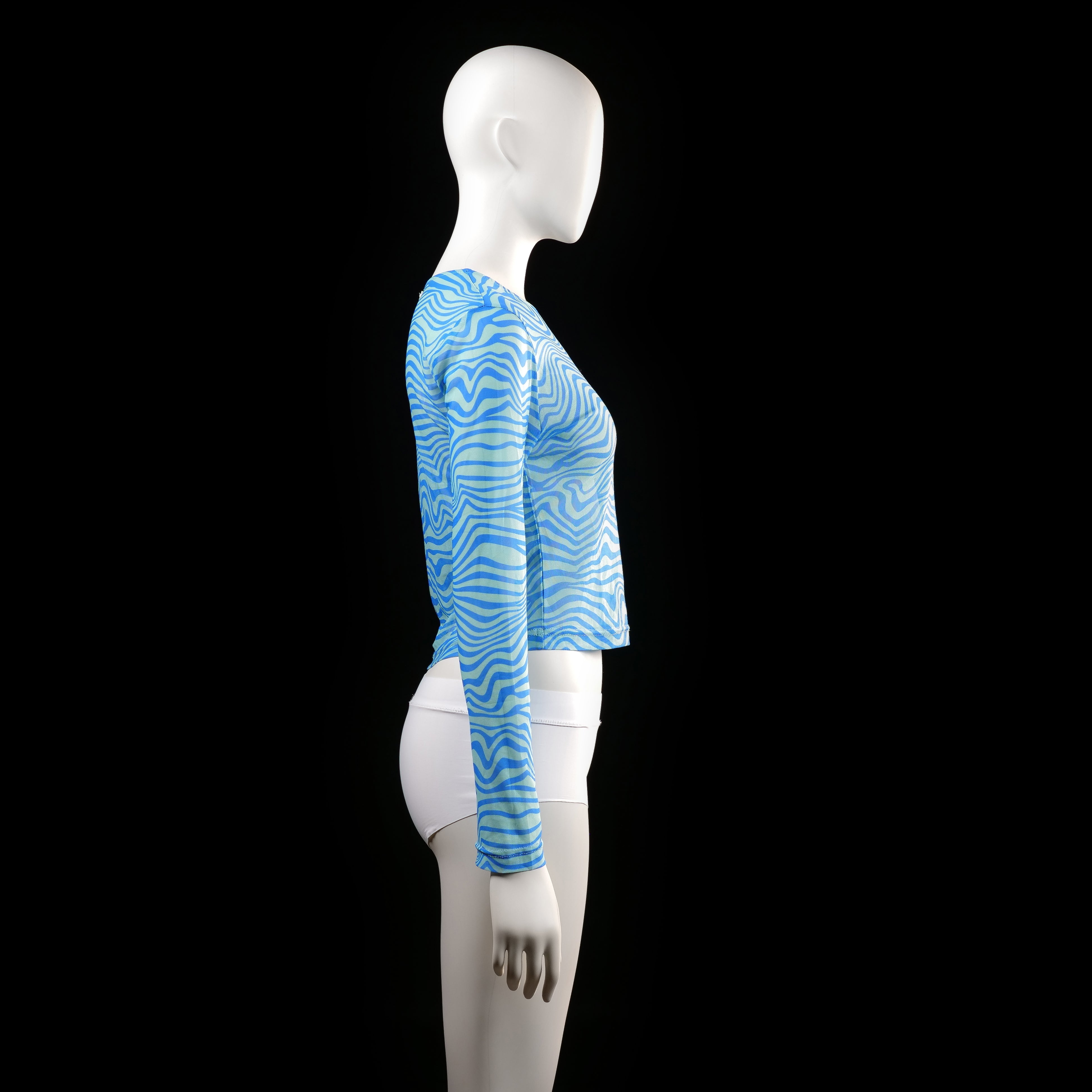 Long-sleeve top with a fitted silhouette and wavy all-over print. Features a back neck keyhole closure with a small button.