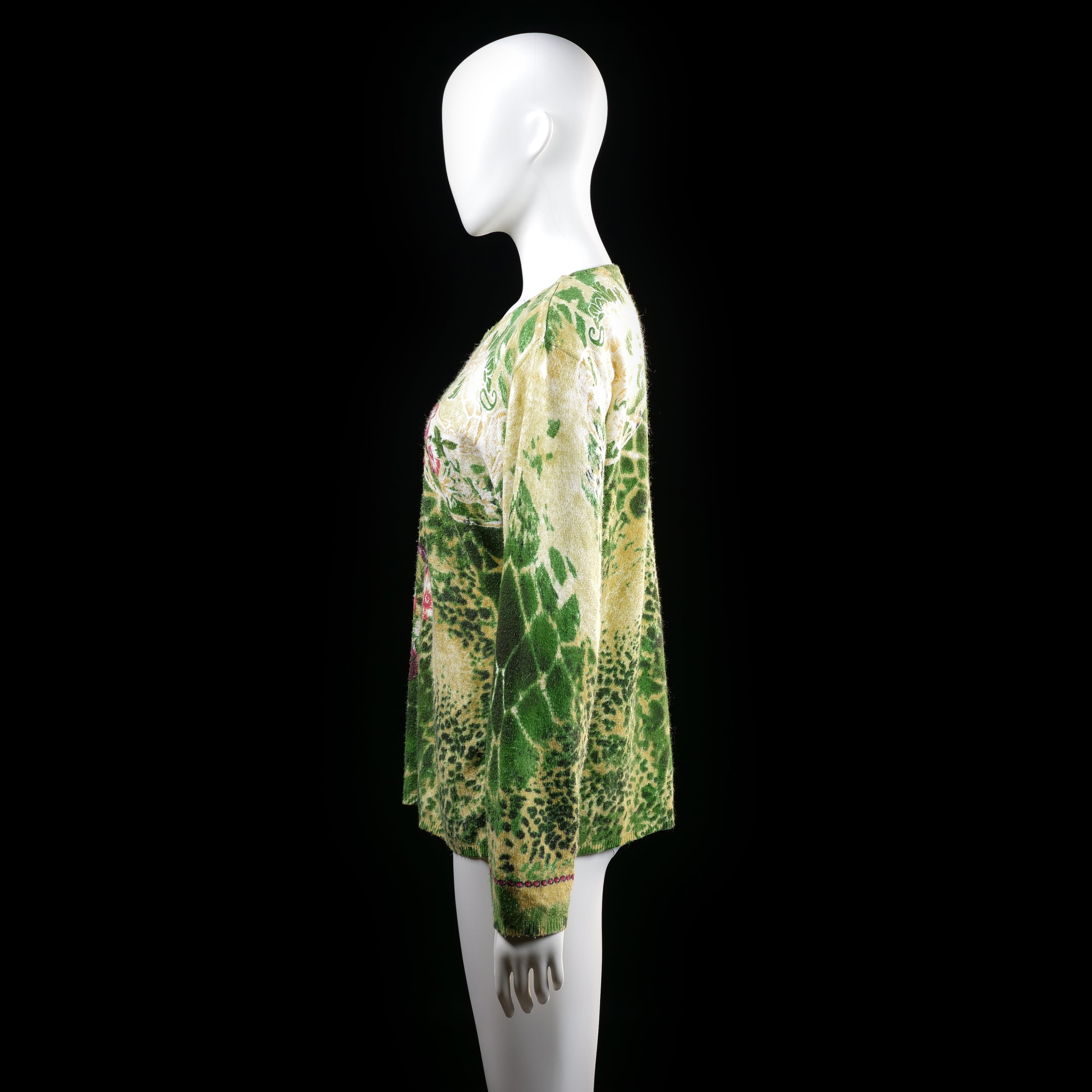 Long-sleeve knit top with a loose fit, featuring a green and beige abstract reptile-like pattern with scattered pink floral print accents. The hem and cuffs are plain with no closures or embellishments.