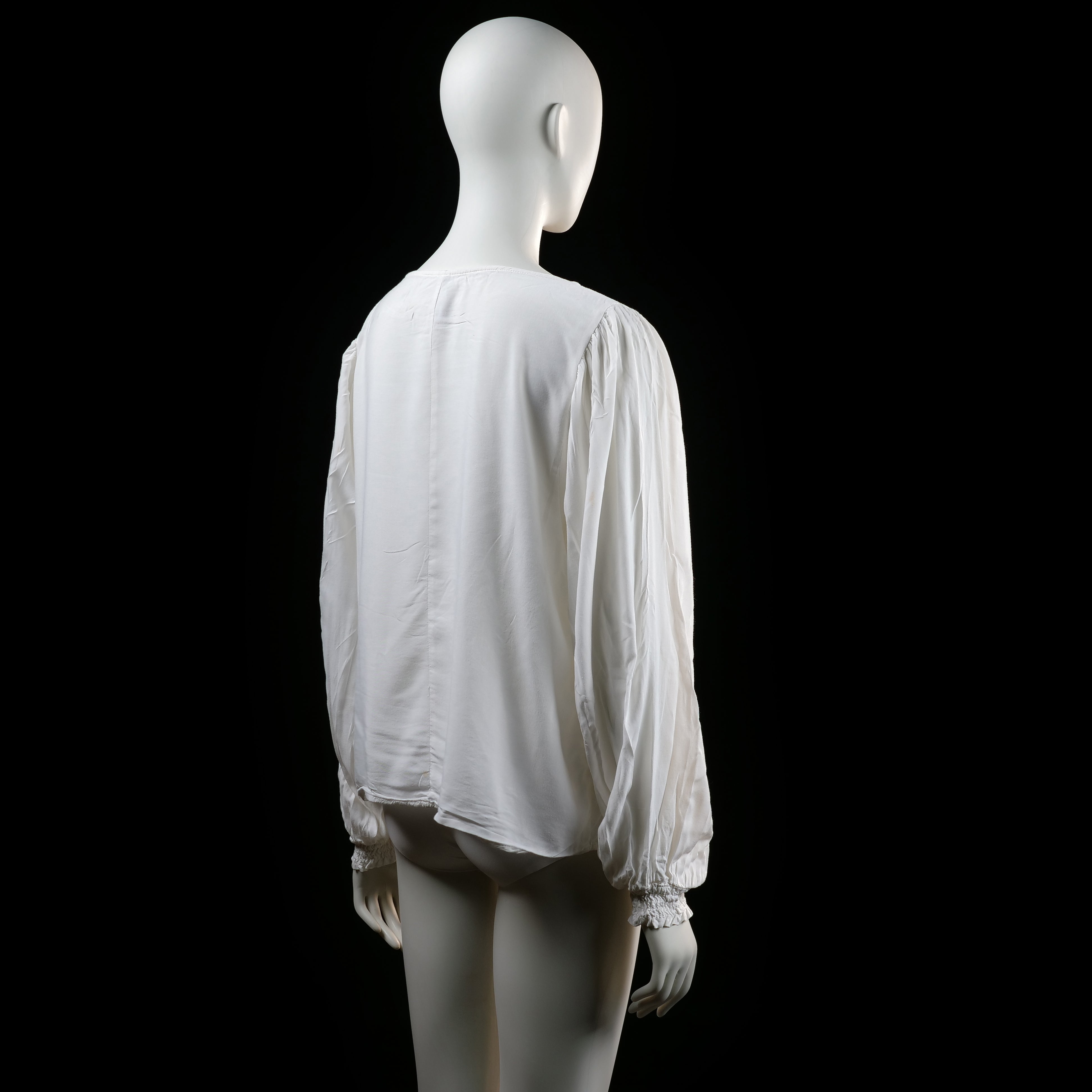 Loose-fitting long-sleeve top with gathered fabric at the shoulders and smocked cuffs. Features a wide round neckline and a slightly rounded hem.