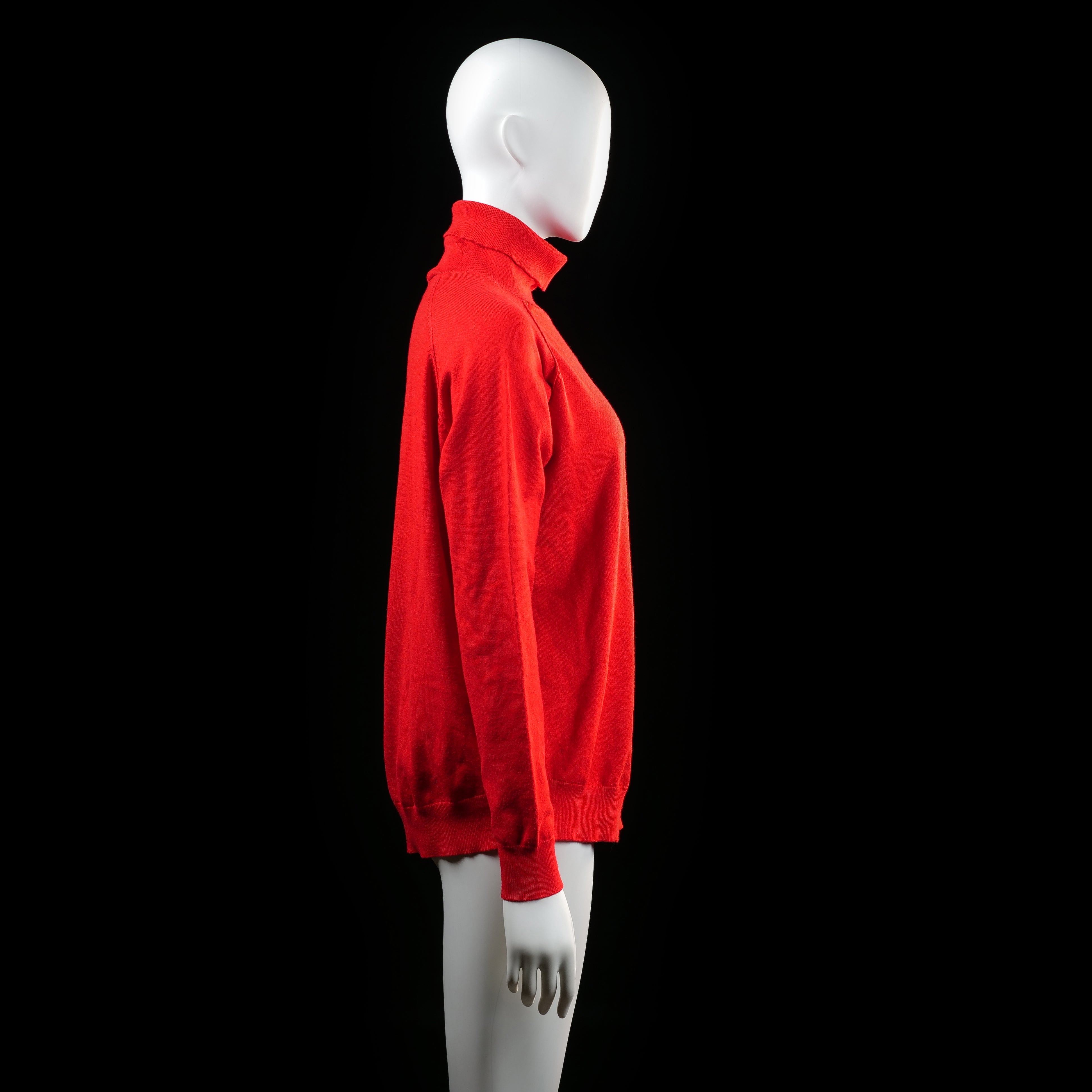 Long-sleeve top with a high turtleneck collar and ribbed cuffs and hem. Solid color with no visible patterns or embellishments.