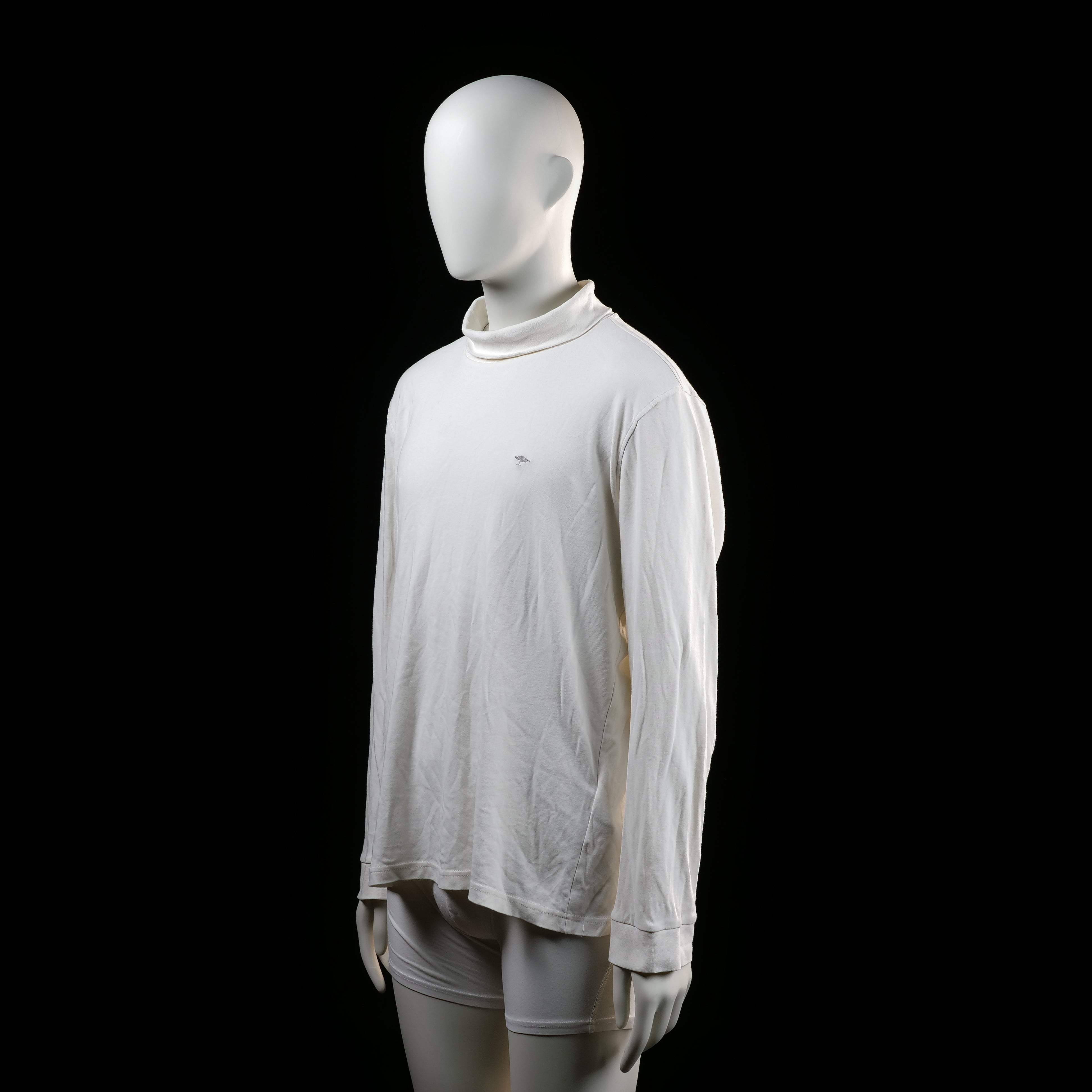 Long-sleeve top with a relaxed fit and a loosely structured turtleneck collar. Features a small chest logo detail on the left side.