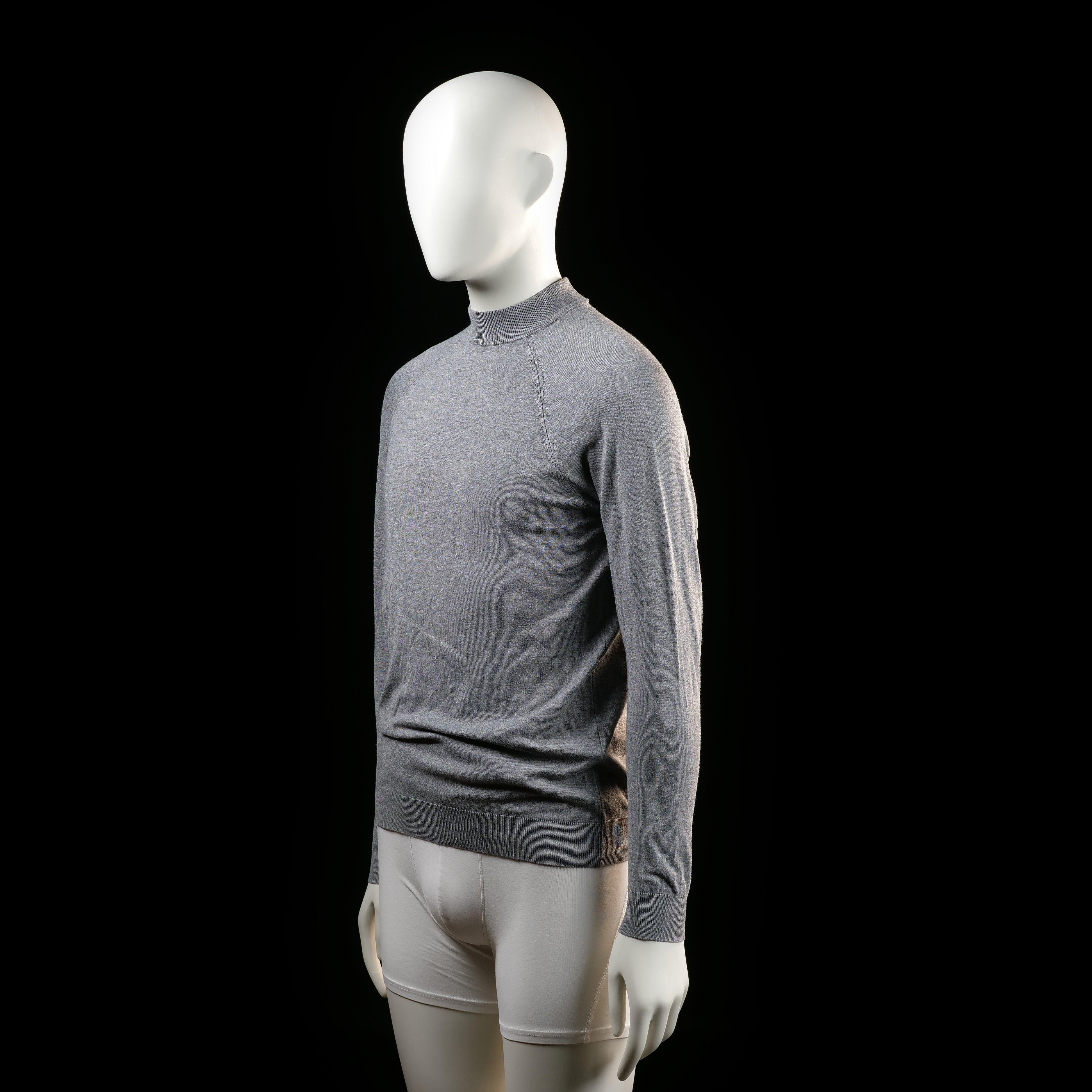 Light gray long-sleeve knit top with a mock neckline and ribbed cuffs and hem. Seam lines run diagonally from the collar to the underarms.