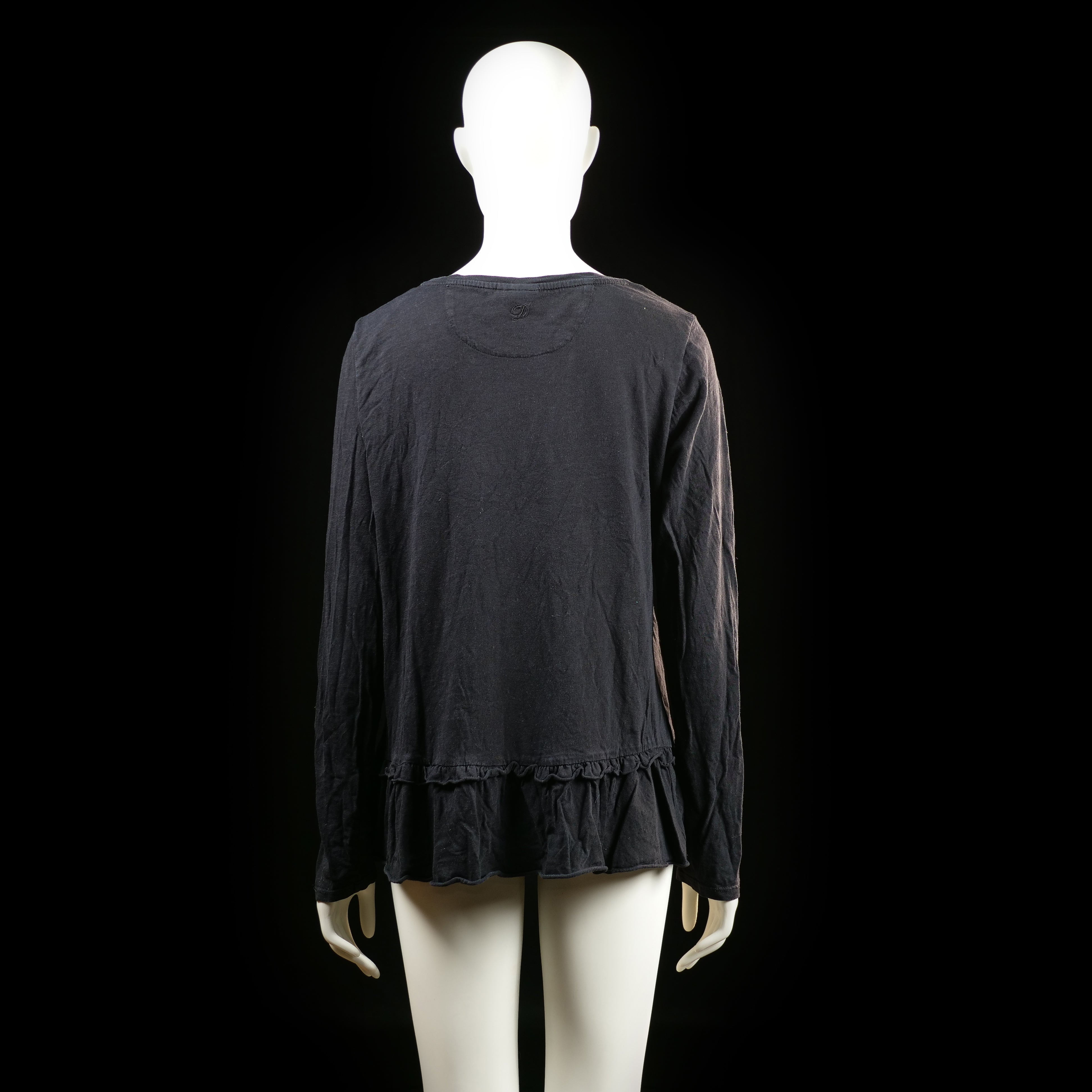 Long-sleeved top with a scoop neckline and a ruffled peplum hem. Plain design without visible closures or embellishments.