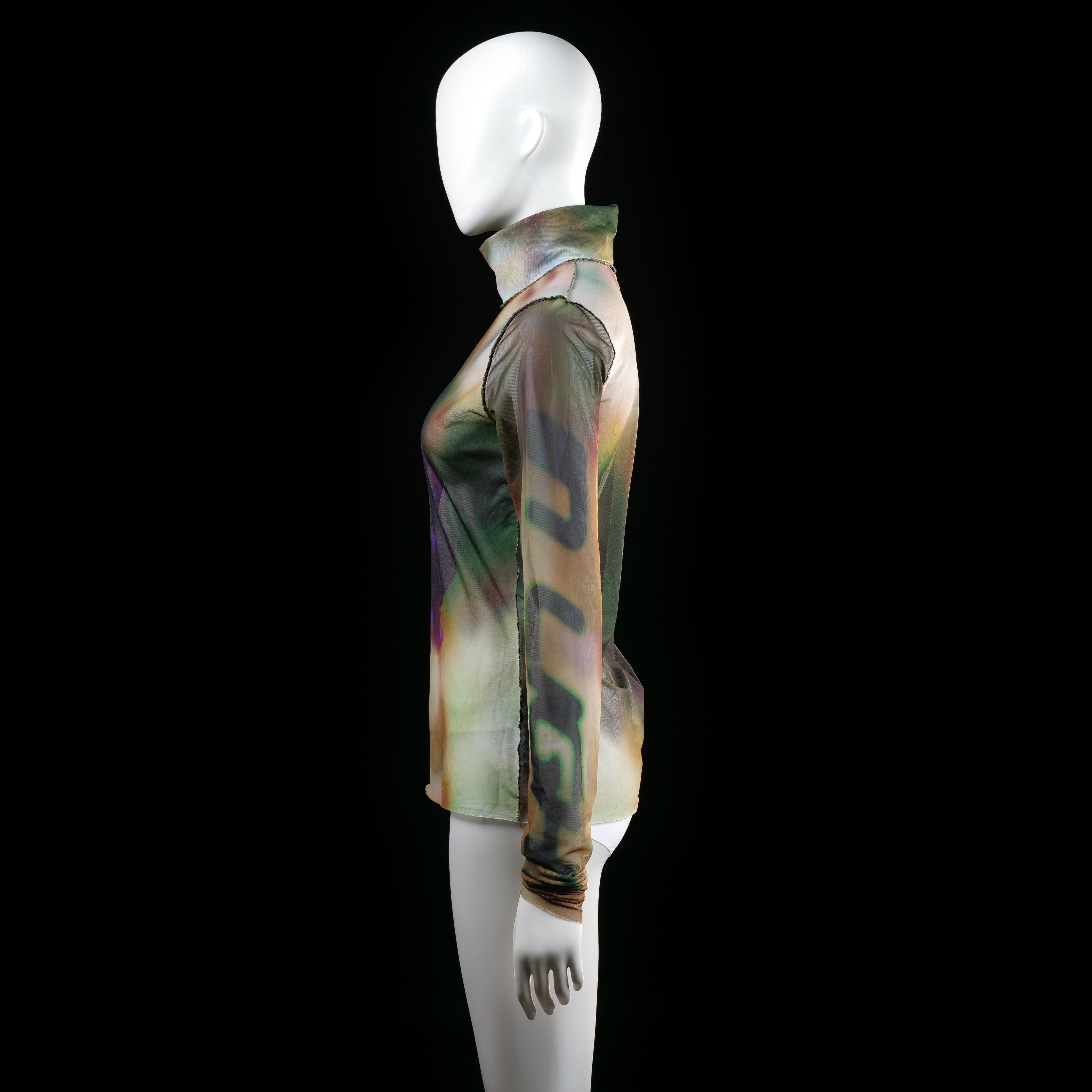 Sheer long-sleeve top with a high neckline and a multicolored abstract print featuring a large face on the front. The fabric is semi-transparent with a blend of blurred graphic elements throughout.