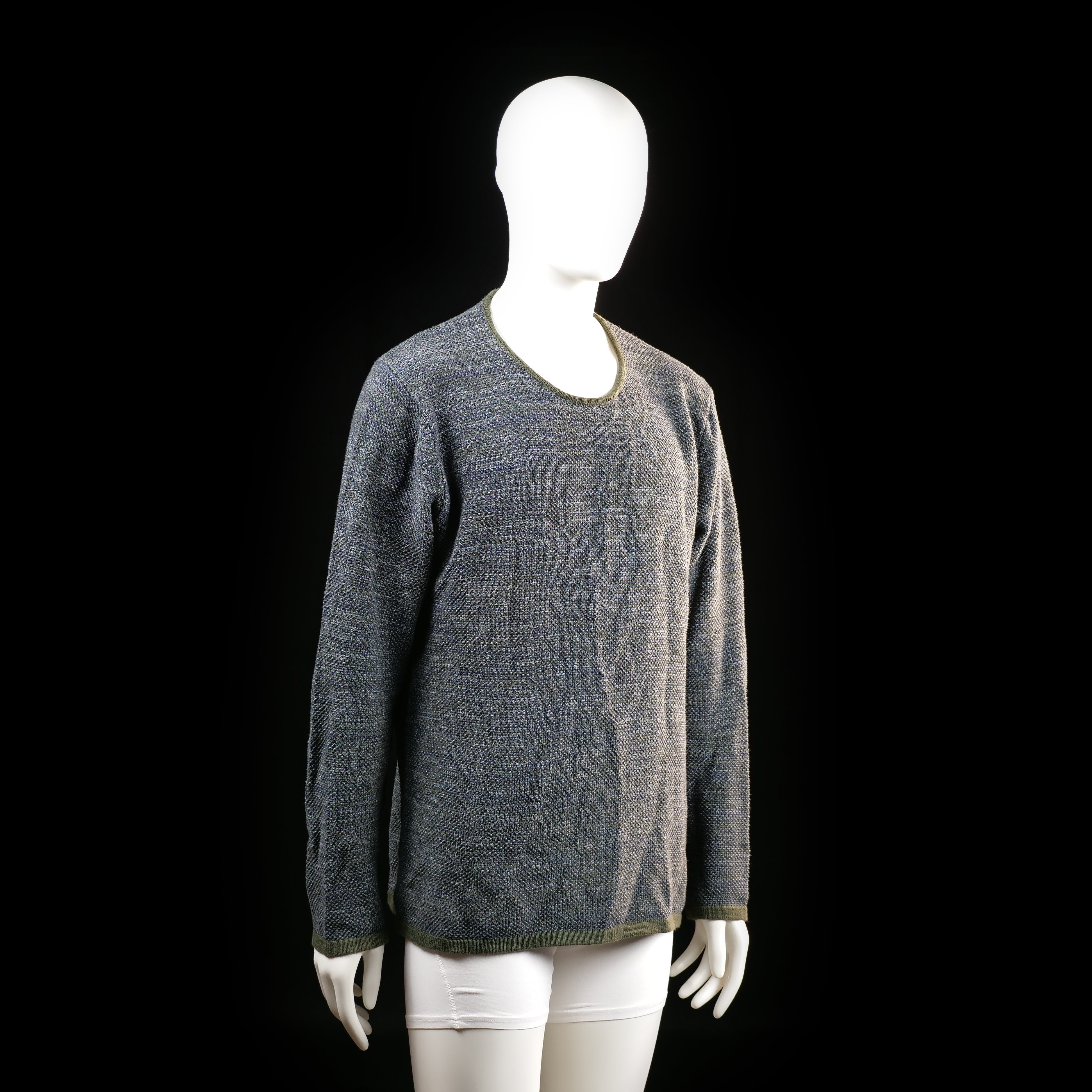 Textured long-sleeve top with a subtle herringbone-like pattern and olive green trim at the neckline, cuffs, and hem. Straight hem and round neckline.