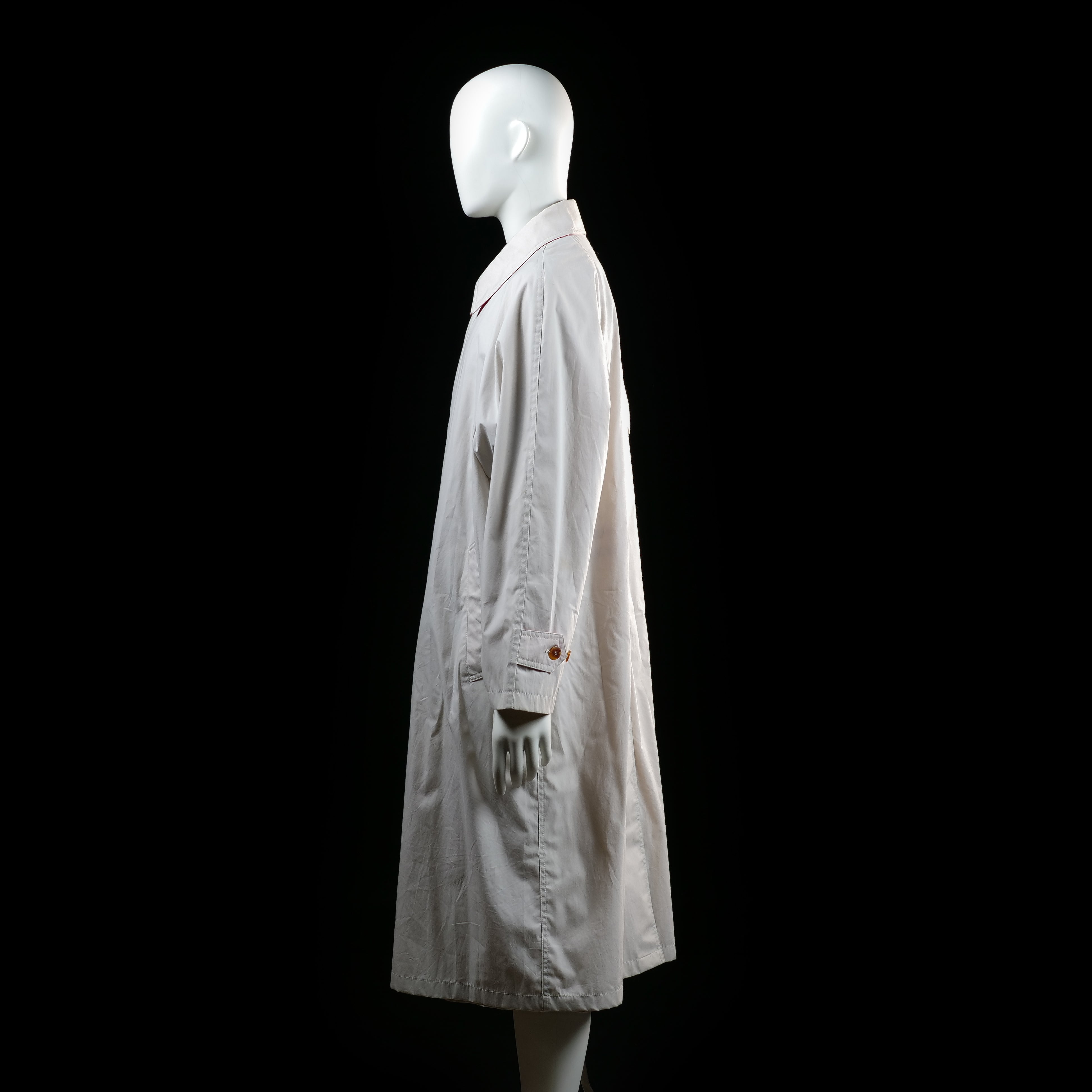 Long coat with a single visible top button and hidden front placket. Features a classic pointed collar, side pockets, and button-tab cuffs.