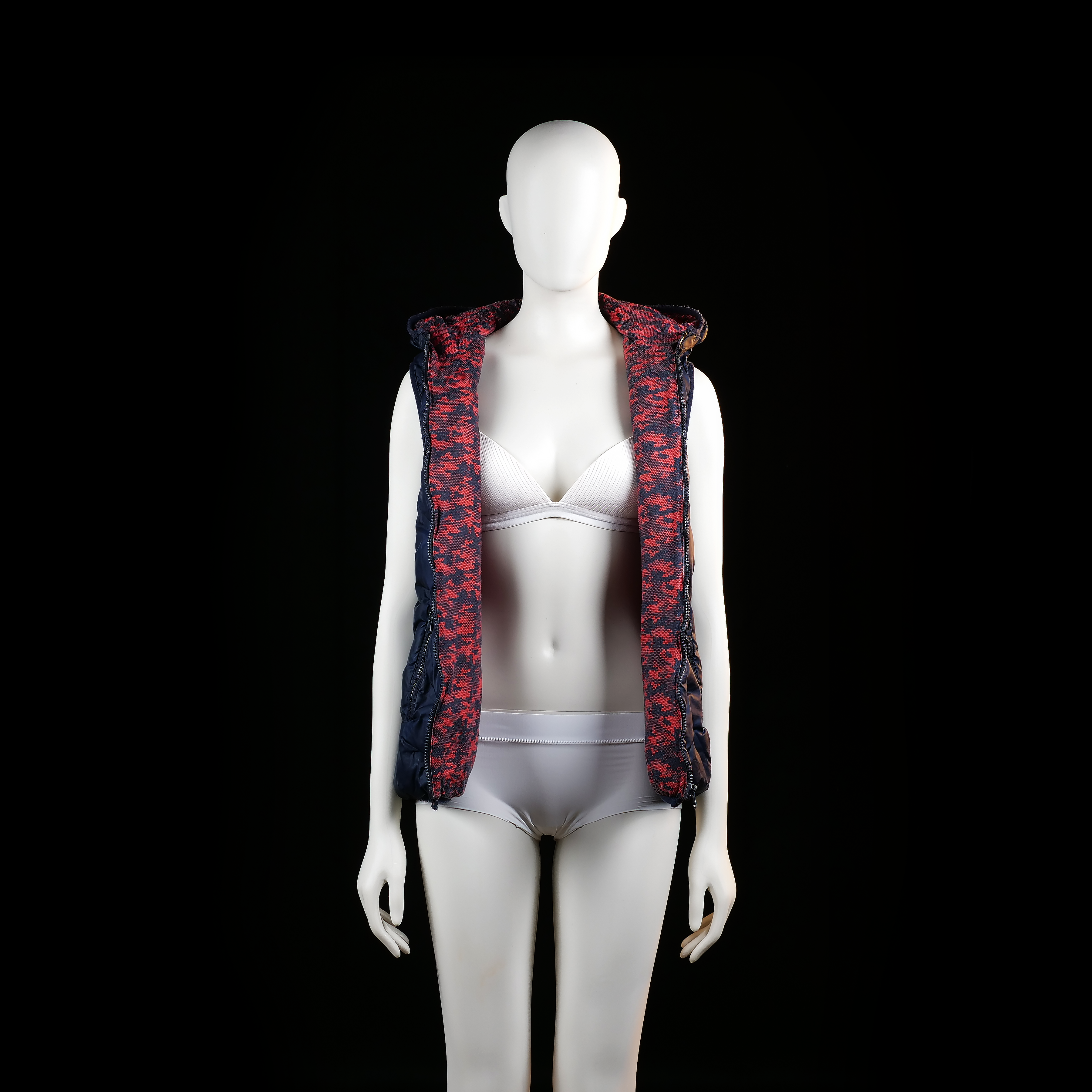 Sleeveless, quilted zip-up vest with a hood and side zipper pockets. The surface has a glossy finish with visible horizontal and diagonal stitching patterns.