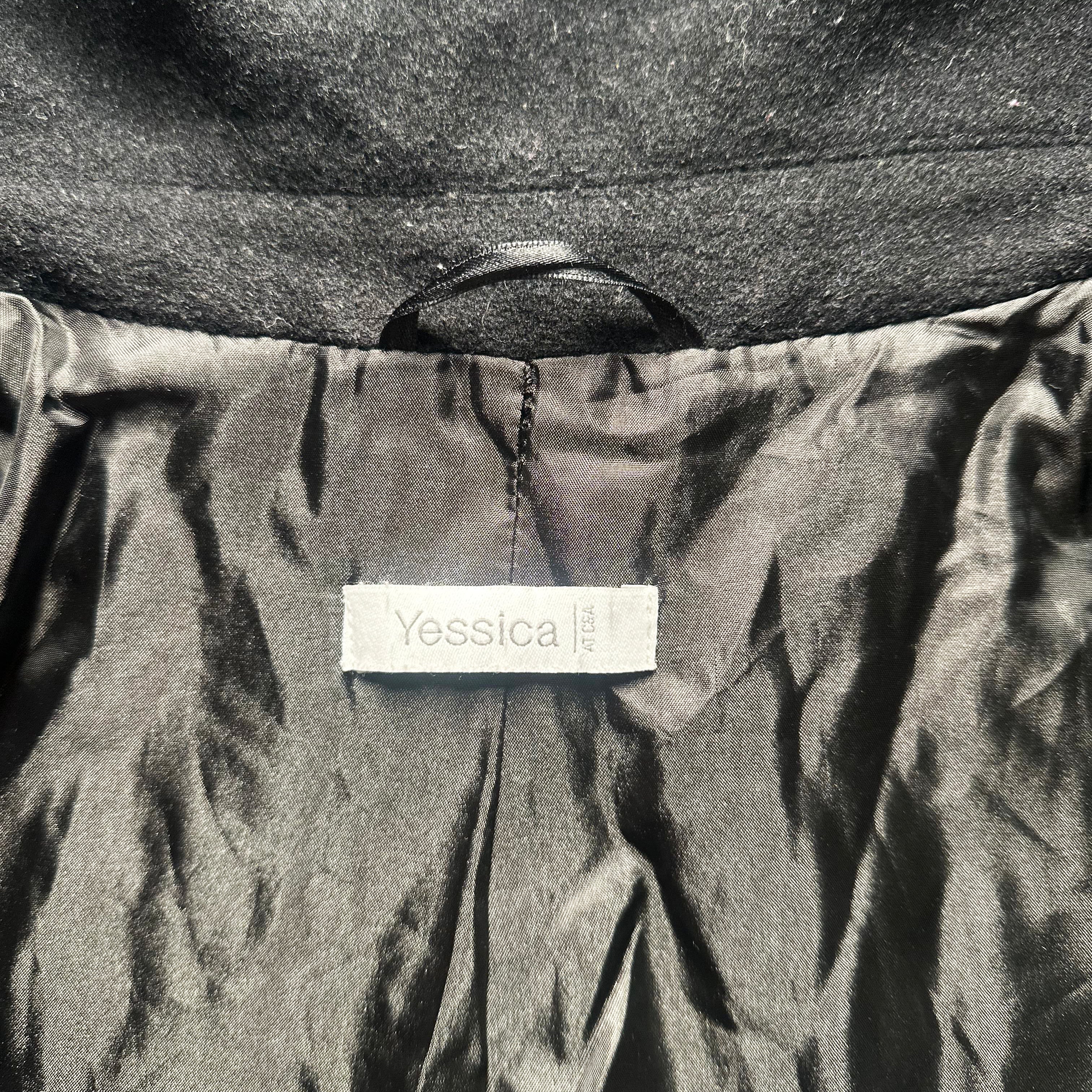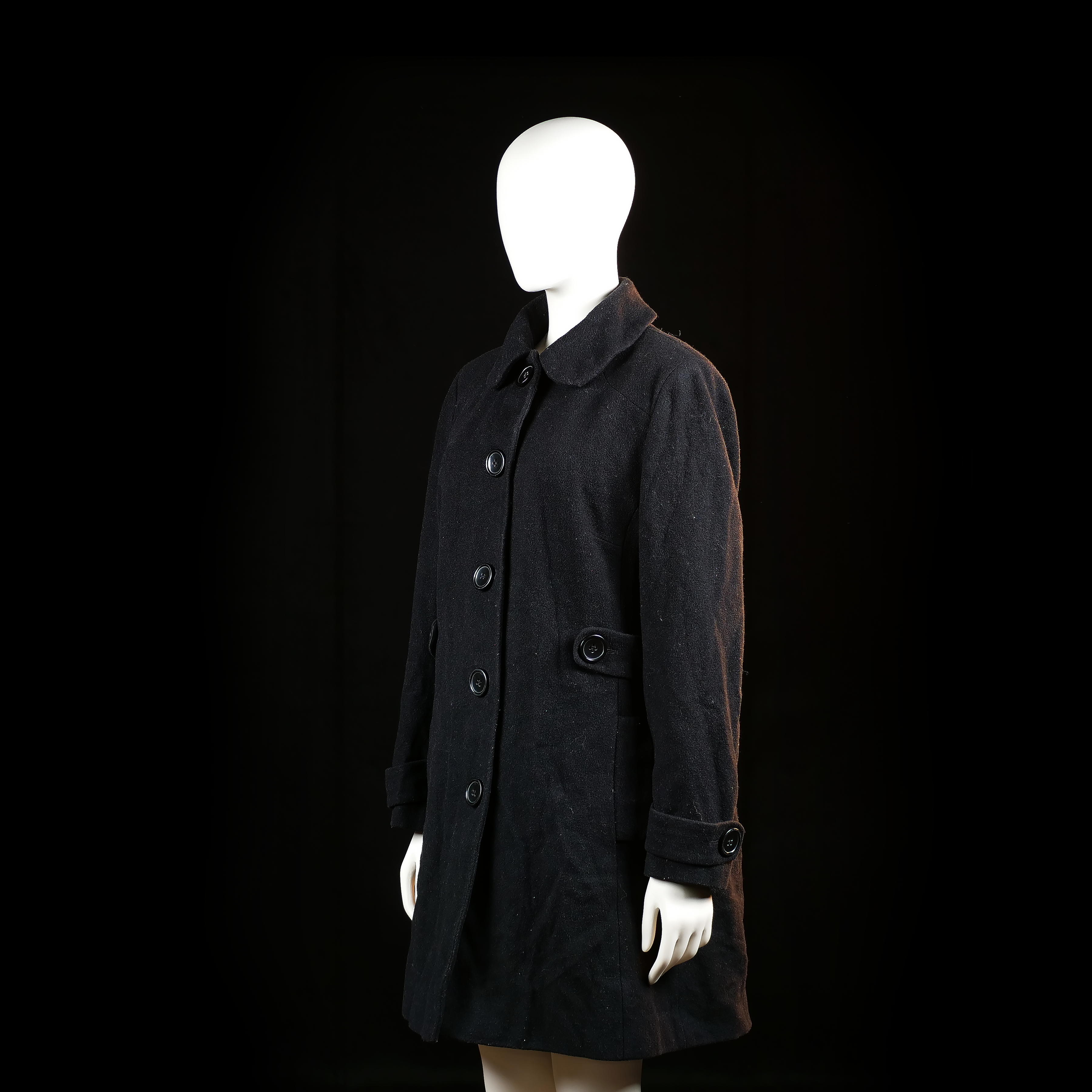 Long coat with a rounded collar, five front buttons, and decorative button-tab details at the cuffs and waist. Back has a smooth finish with symmetrical side waist tabs.